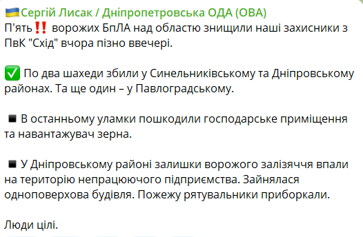 "Пять вражеских БПЛА над областью уничтожили наши защитники из ПВК "Восток" вчера поздно вечером. По два "Шахеда" сбили в Синельниковском и Днепровском районах. И еще один – в Павлоградском", - написал он.