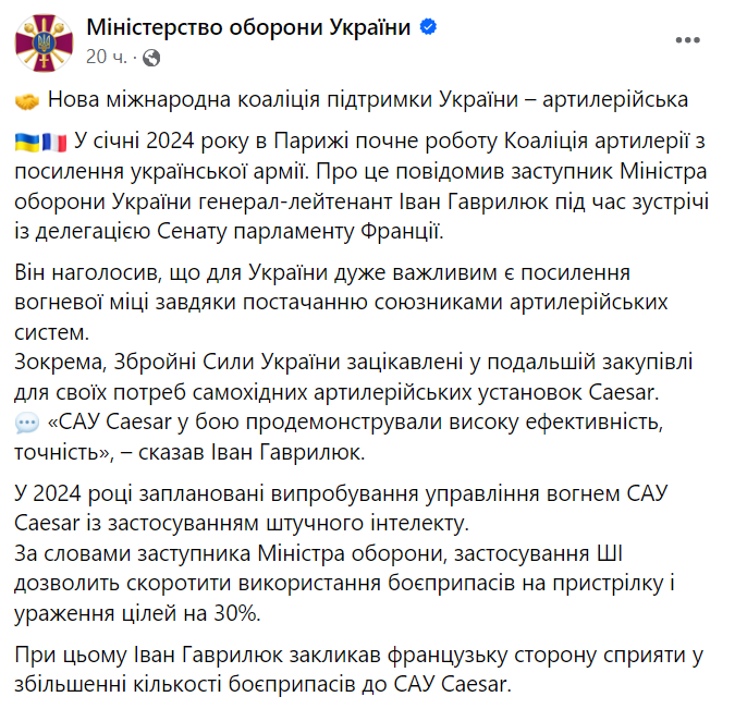 Пока из коалиции известно участие только Франции. ВСУ намерены закупать у нее самоходные артиллерийские установки Caesar.
