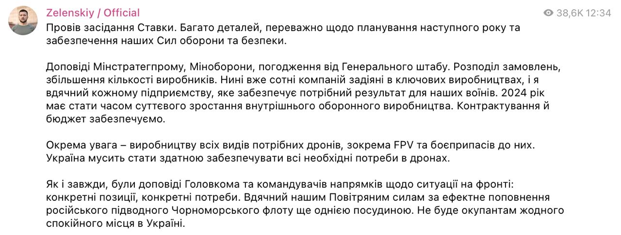 "Много деталей, главным образом относительно планирования следующего года и обеспечения наших сил обороны и безопасности. Доклады Минстратегпрома, Минобороны, согласования от Генерального штаба. Распределение заказов, увеличение количества производителей", - пишет Зеленский.