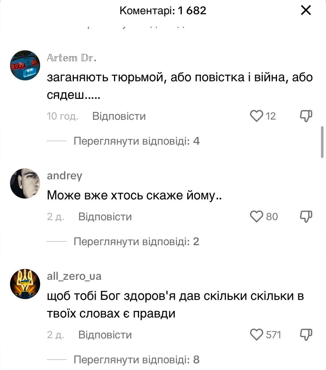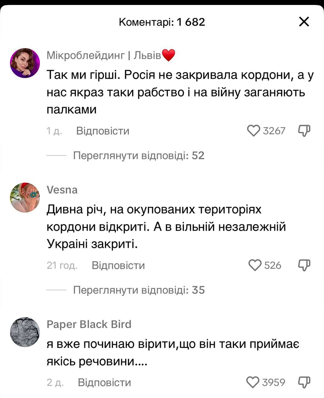 "Так мы хуже. Россия не закрывала границы, а у нас как раз рабство и на войну загоняют палками", "Нам останется одно. Не идти на войну, сопротивляться, биться, но не идти. Спасать нацию. Они хотят нас уничтожить", "Загоняют тюрьмой. Или повестка и война, или сядешь", "Мы ничем не лучше России. Нас насильно ТЦК гребет", "После таких законов действительно выглядит так, что нас нужно спасать", - пишут люди.