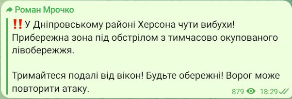18:31 Херсон под обстрелом с левого берега Днепра, сообщает глава города Роман Мрочко.