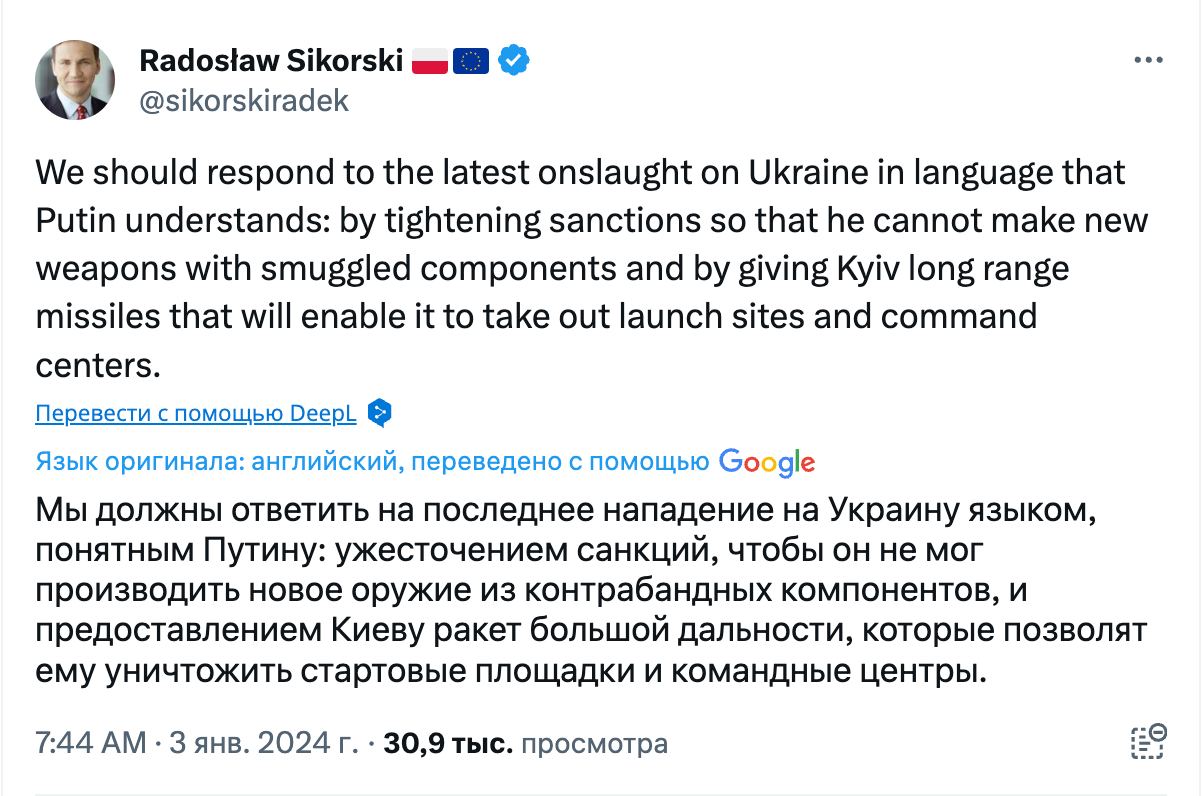 "Мы должны ответить на последнее нападение на Украину языком, понятным Путину: ужесточением санкций, чтобы он не мог производить новое оружие из контрабандных компонентов, и предоставлением Киеву ракет большой дальности, которые позволят ему уничтожить стартовые площадки и командные центры", - написал Сикорский в Х.