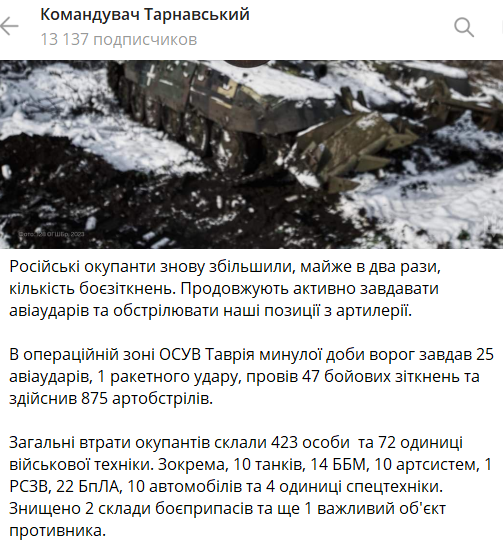 Также, по его словам, за прошедшие сутки россияне нанесли 25 авиаударов, один ракетный удар и совершили 875 артобстрелов.