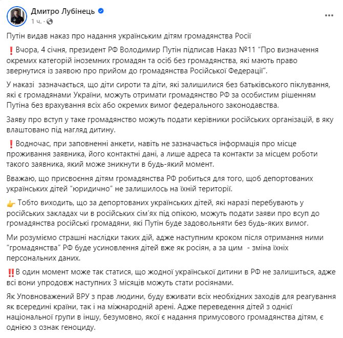 "...В указе отмечается, что дети-сироты и дети, оставшиеся без родительской опеки, являющиеся гражданами Украины, могут получить гражданство РФ по личному решению Путина... Заявление о вступлении в такое гражданство могут подать руководители российских организаций, в которой устроен ребенок", – объяснил Лубинец.