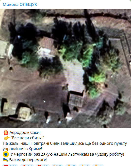 "Аэродром Саки! "Все цели сбиты!" К сожалению, наши Воздушные Силы остались без одного пункта управления в Крыму! В очередной раз спасибо нашим летчикам за отличную работу!", - написал он.
