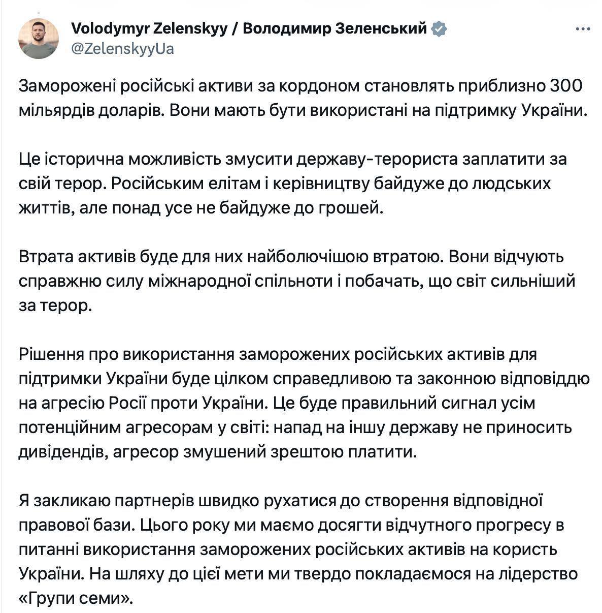 "Российские элиты и руководства безразличны к человеческим жизням, но больше всего не безразличны к деньгам. Потеря активов будет для них самой болезненной потерей. Они ощутят истинную силу международного сообщества и увидят, что мир сильнее террора. Решение об использовании замороженных российских активов для поддержки Украины будет вполне справедливым и законным ответом на агрессию России против Украины. Это будет правильный сигнал всем потенциальным агрессорам в мире: нападение на другое государство не приносит дивидендов, агрессор вынужден в конце концов платить", - сказано в посте.