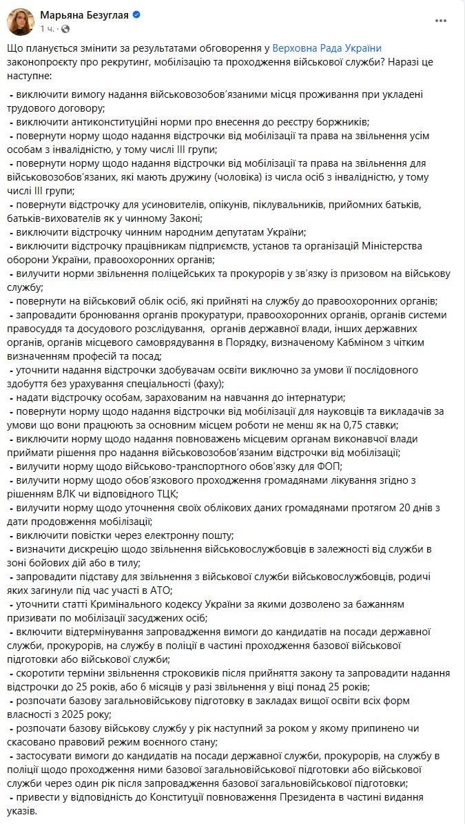 Народный депутат Марьяна Безуглая опубликовала список изменений, которые предполагается внести в законопроект о мобилизации.