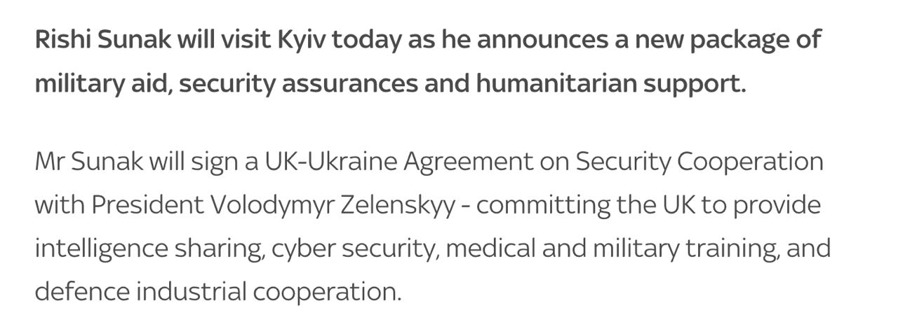 "Сегодня мы идем дальше – увеличиваем нашу военную помощь, поставляем тысячи новейших дронов и подписываем новое историческое соглашение о безопасности, чтобы предоставить Украине гарантии, необходимые ей на долгосрочную перспективу", - цитирует газета Сунака.