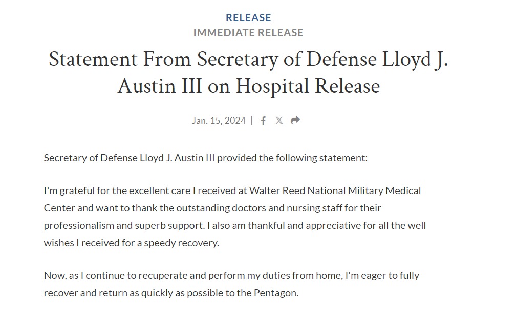 "Министр Остин хорошо прогрессировал за время своего пребывания в больнице, и его силы восстанавливаются. Он прошел ряд медицинских обследований и проверок и получал нехирургическую помощь для удовлетворения своих медицинских потребностей, включая устранение некоторых затяжных болей в ногах. Его выписали домой с плановой физиотерапией и под регулярное наблюдение. Ожидается, что секретарь полностью выздоровеет", - отметили доктора.