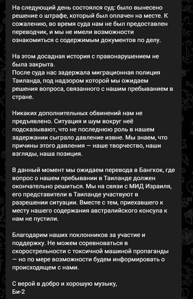 Музыканты российской группы "Би-2", поддержавшей Украину, сделали заявление из Таиланда, где их по-прежнему задерживает местная полиция. Артистов содержат в центре миграционной полиции острова Пхукет.