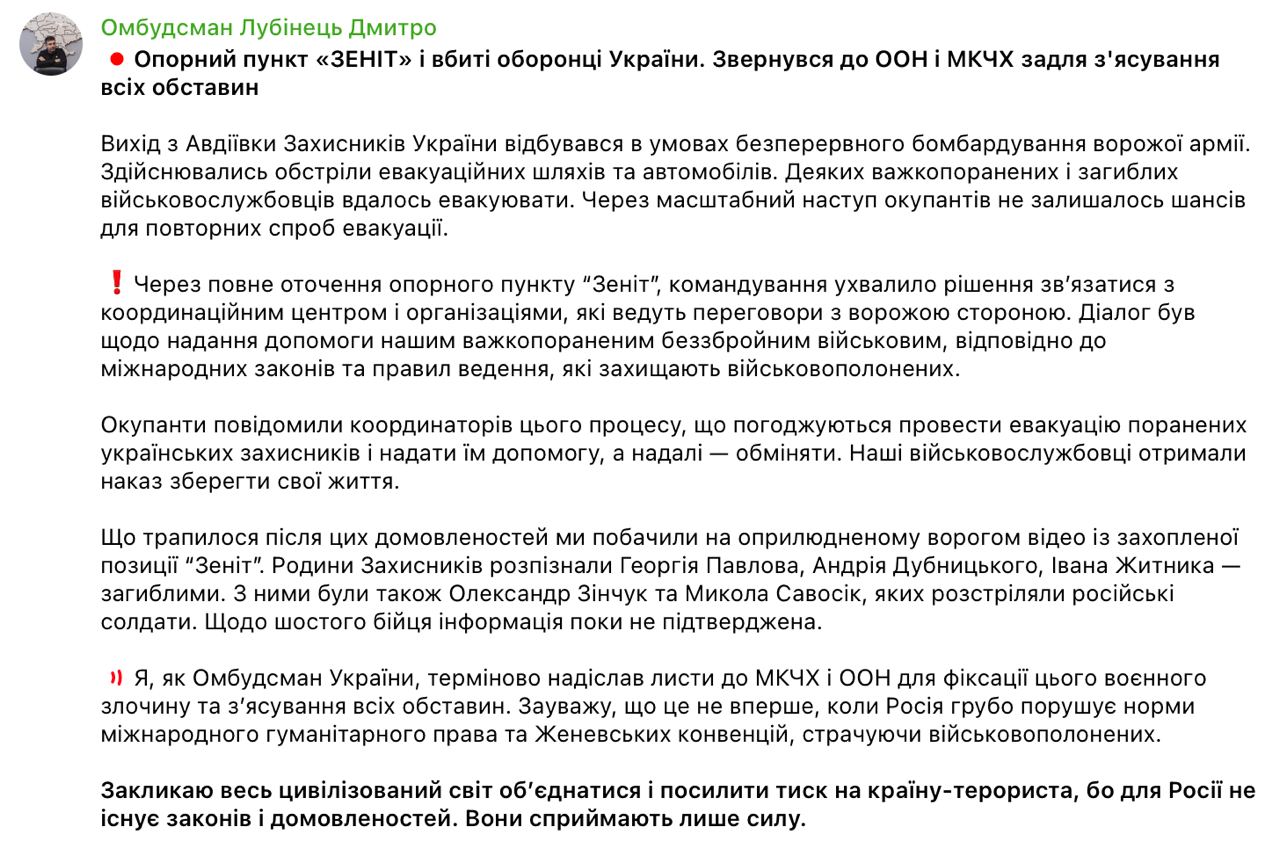 11.25 Омбудсмен Лубинец обратился в ООН и Красный Крест по поводу раненных украинских военных, взятых в плен на опорном пункте "Зенит", что южнее Авдеевки, которых, как вчера заявила 110-я бригада ВСУ, затем расстреляли россияне.