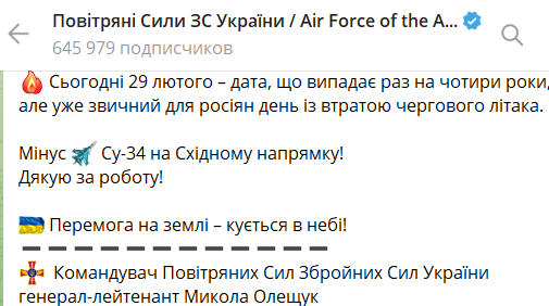 "Сегодня, 29 февраля, - дата, которая выпадает раз в четыре года, но уже привычный для россиян день с потерей очередного самолета. Минус Су-34 на Восточном направлении", - заявил Олещук.