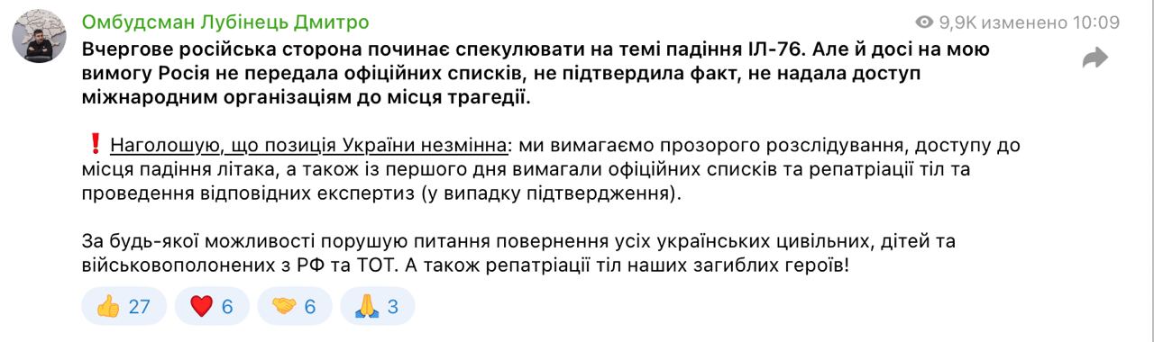 11.03 Омбудсмен Лубинец прокомментировал заявление РФ о готовности передать Украине останки украинских пленных, погибших, как утверждает Москва, при крушении Ил-76 в Белгородской области.