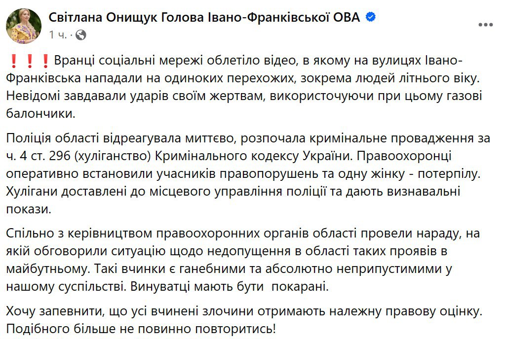 Об этом сообщила глава Ивано-Франковской областной военной администрации Светлана Онищук в Фейсбуке.