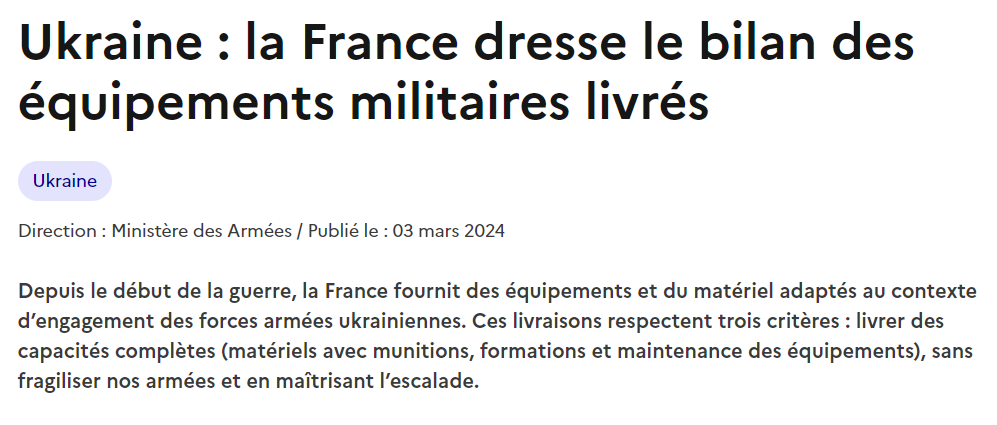 "В целом Франция поставила в Украину военной техники на общую сумму 2,615 млрд евро, к которым добавлено 1,2 млрд евро, пожертвованные в Европейский фонд мира (EFF), то есть поддержка на сумму свыше 3,8 млрд евро в период с 24 февраля 2022 года. до 31 декабря 2023. Эти финансовые усилия сопровождаются решительными действиями в сфере обучения, поскольку около 10 000 украинских солдат уже прошли обучение в армиях Польши и Франции", - говорится в документе.