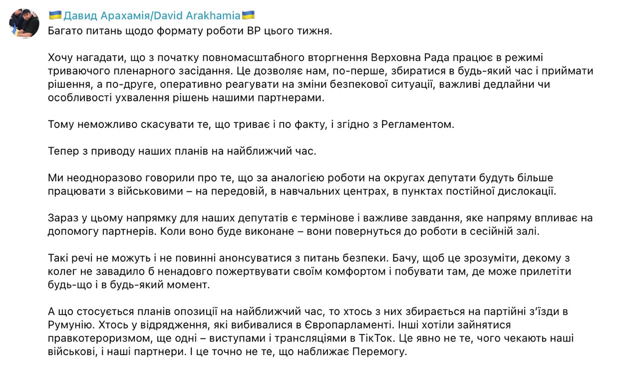Глава фракции "Слуги народа" Давид Арахамия дал понять, что заседаний Верховной Рады на этой неделе не будет.