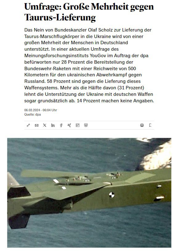 Большинство немцев по-прежнему не поддерживают поставок Украине ракет Taurus и солидарны в этом с канцлером ФРГ Олафом Шольцем.