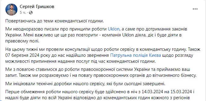 "Мы с уважением относимся к работе правоохранительной системы Украины и принимаем ваш запрос... Первое ограничение работы нашего сервиса будет осуществлено в ночь с 14.03.2024 на 15.03.2024 и в дальнейшем будет действовать по всей Украине в соответствии с комендантскими часами каждого из регионов", - отметил Гришков.