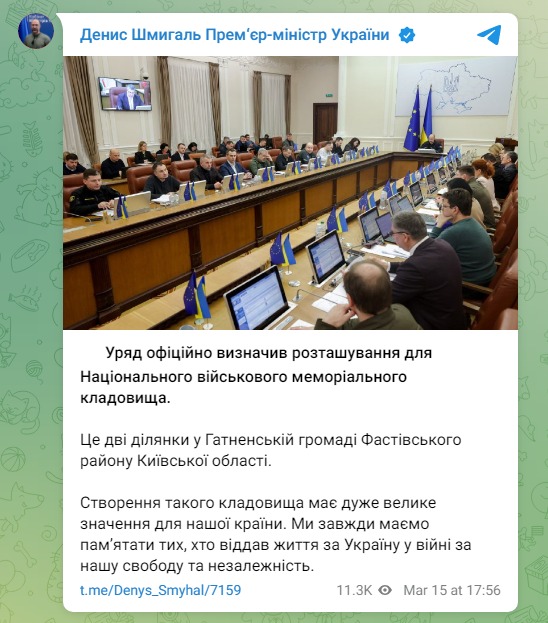 "Создание такого кладбища имеет очень большое значение для нашей страны, и потому в центре внимания нашего правительства. Мы всегда должны помнить тех, кто отдал свою жизнь за Украину в войне за нашу свободу и независимость", – отметил Шмигаль.