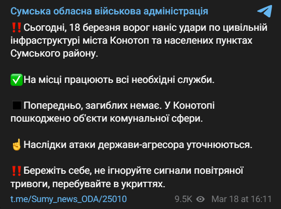 Сегодня днем российские войска нанесли удары по гражданской инфраструктуре города Конотоп и населенным пунктам Сумского района.