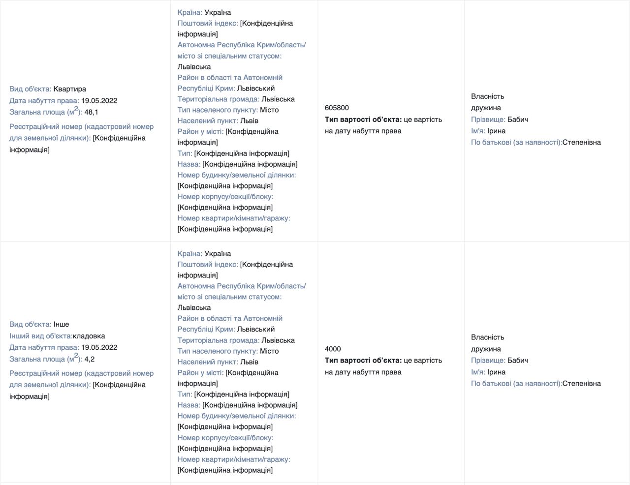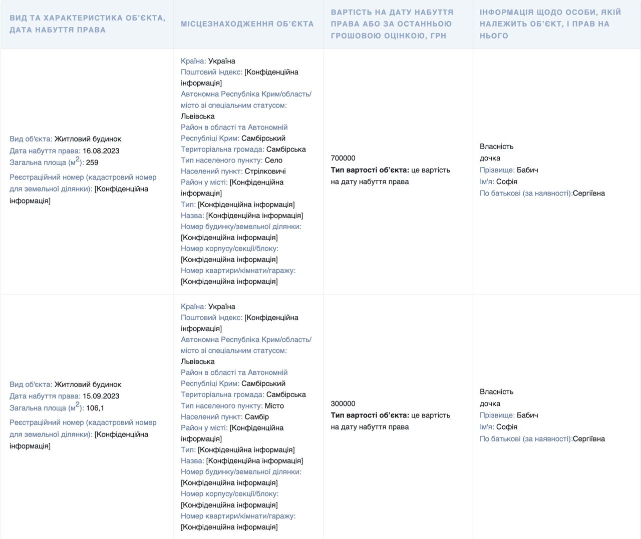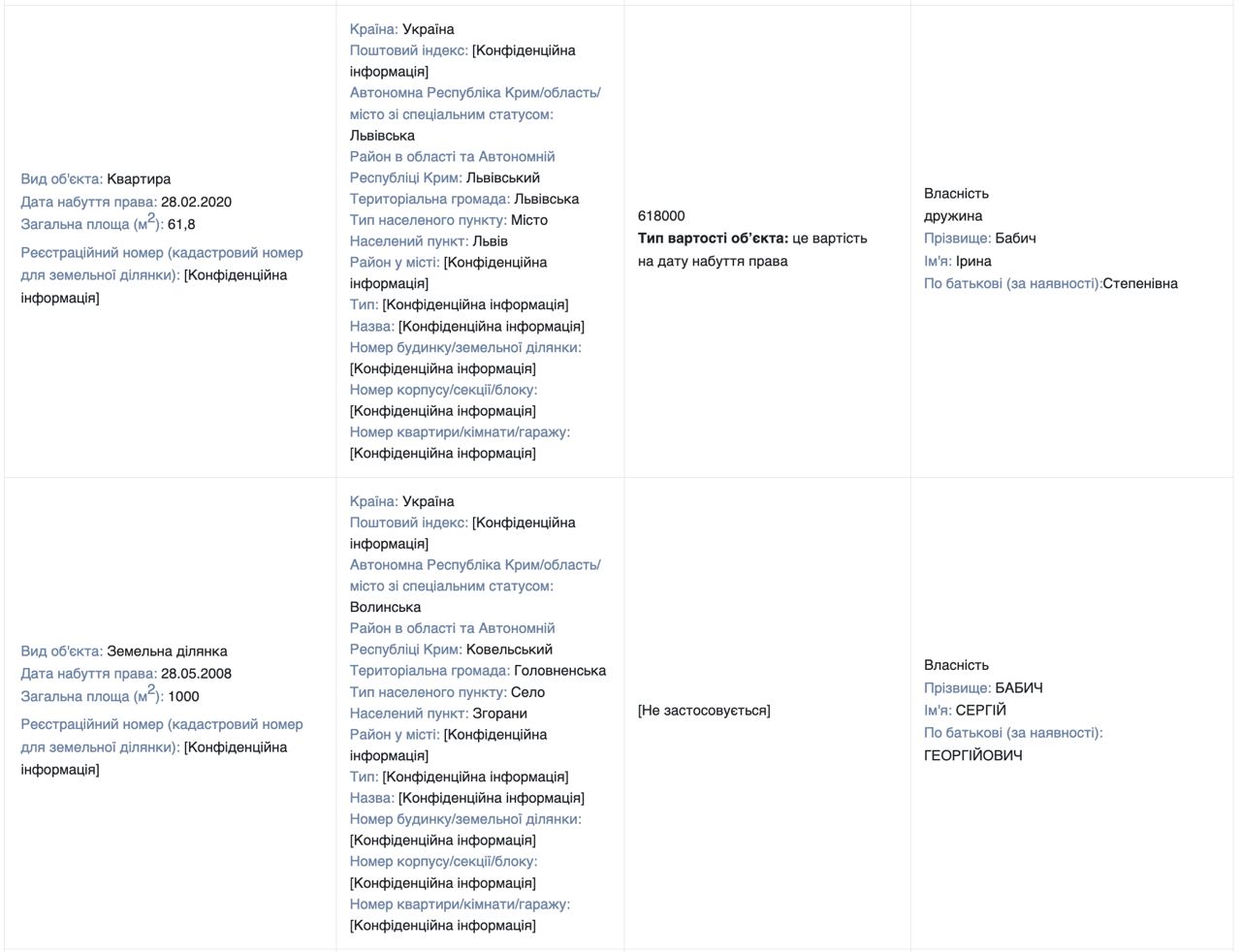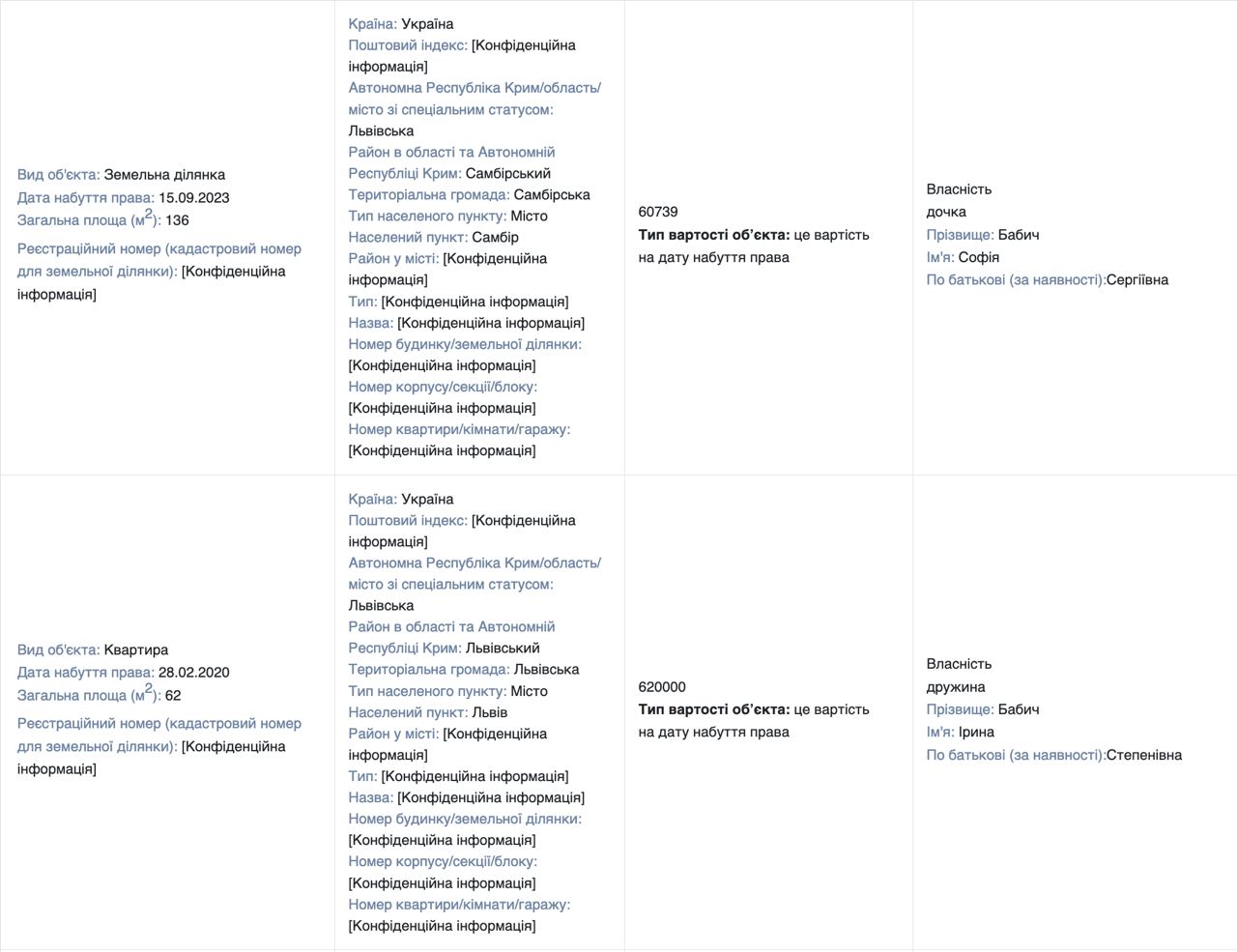 В собственности самого Бабича числятся только два земельных участка. Два жилых дома и земельный участок во Львовской области он переписал на свою дочь-студентку.