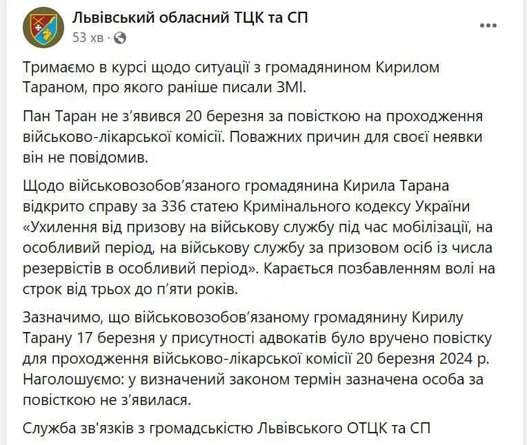 На днях Львовский ТЦК прокомментировал задержание волонтера. В ТЦК заявили, что он не выполнил требования военнослужащих и не предъявил военно-учетные документы представителям ТЦК и СП, также сообщается, что он "провоцировал конфликт". Также при смене места жительства Таран в 7 дневный срок не стал на учет в ТЦК и СП по новому месту жительства и отказался от прохождения ВЛК.