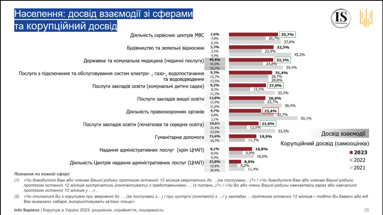 Исследование также демонстрирует оценку коррупционного опыта граждан. Чаще всего сталкиваются с коррупцией те, кто обращается в сервисные центры Министерства внутренних дел, получает услуги в сферах строительства и земельных отношений, медицины, а также по подключению или обслуживанию систем электро-, газо- и водоснабжения, водоотведения.