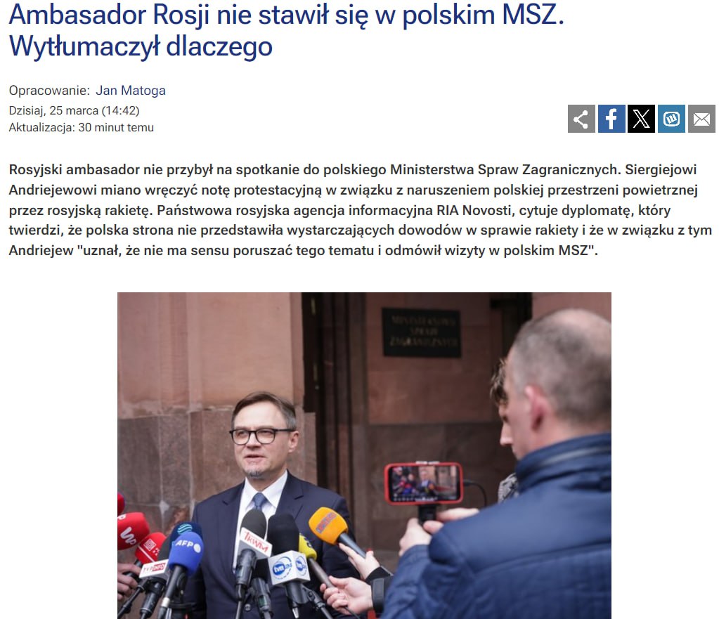 Напомним, 24 марта одна из российских ракет во время ночной атаки на западную Украину зашла на 39 секунд в воздушное пространство Польши около города Осердув.