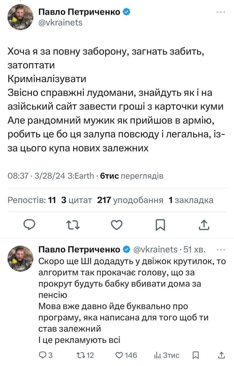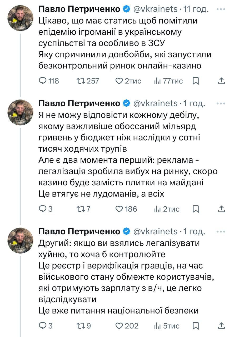 "Интересно, что должно произойти, чтобы заметили эпидемию игромании в украинском обществе и особенно в ВСУ. Которую вызвали долб**бы, которые запустили бесконтрольный рынок онлайн-казино. Если вы взялись легализовать х**ню, то хотя бы контролируйте", - пишет Петриченко.