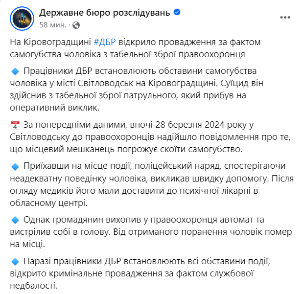 Государственное бюро расследований подтвердило информацию "Страны" о самоубийстве мужчины в Кировоградской области из табельного оружия патрульного.