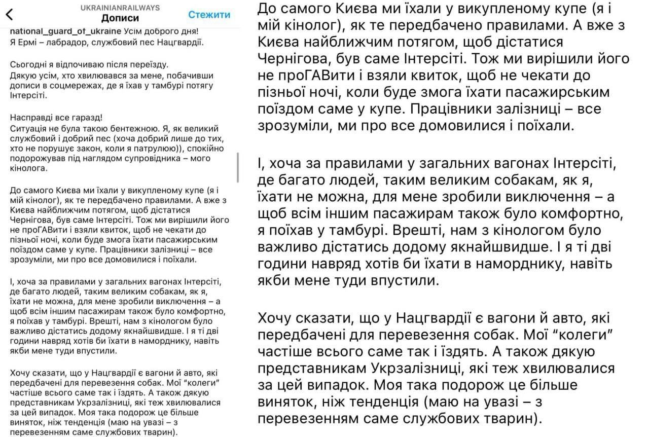 Как выяснилось позже, военный ехал со служебным псом Нацгвардии по имени Эрми. В своем посте "Укрзалізниця" и страница Нацгвардии сообщили, что до Киева собака и кинолог ехали в выкупленном купе. После чего до Чернигова кинолог с псом добирались на "Интерсити" в тамбуре, чтобы не мешать другим пассажирам.