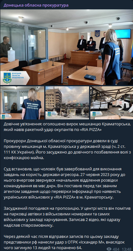 Житель Краматорска получил пожизненное заключение за наводку ракет на пиццерию "RIA PIZZA" летом прошлом года, где погибли 13 человек. Следствия установило, что мужчина работал на газотранспортном предприятии и был завербован Россией.