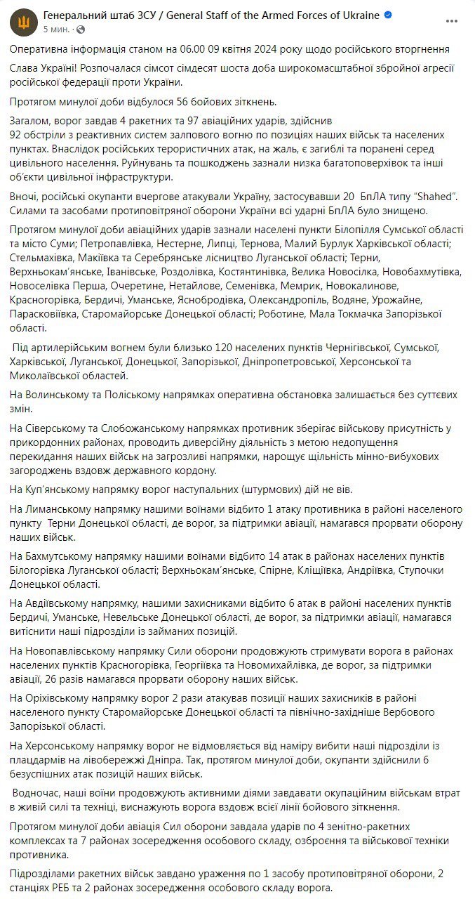 Утром 9 апреля Генштаб ВСУ обнародовал сводку о ситуации на фронте за минувшие сутки.