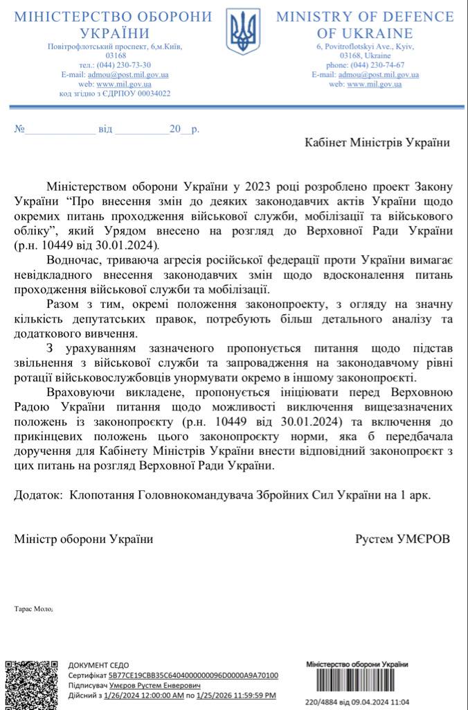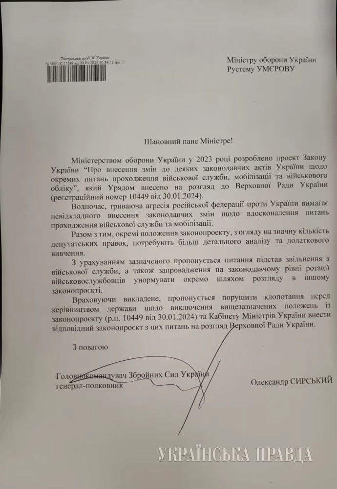 В письме к министру обороны Рустему Умерову Сырский пишет, что вопрос увольнения со службы следует рассмотреть отдельным законопроектом.