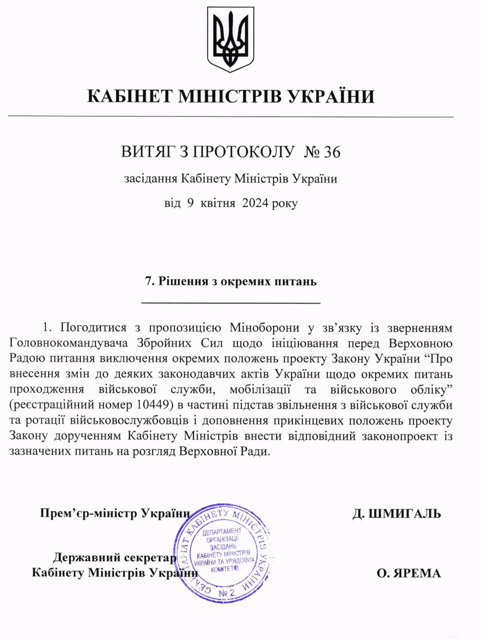 "Вместе с тем, отдельные положения законопроекта, учитывая значительное количество депутатских правок, требуют более детального анализа и дополнительного изучения. С учетом указанного предлагается вопрос оснований увольнения с военной службы, а также введение на законодательном уровне ротации военнослужащих нормировать отдельно путем рассмотрения в другом законопроекте", – написал главком.