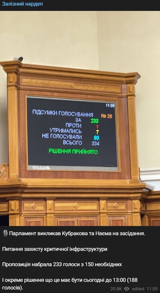 После ракетного удара РФ по Трипольской ТЭС Верховная Рада вызвала министра инфраструктуры Александра Кубракова и главу Госагентства восстановления инфраструктуры Мустафу Найема на заседание.