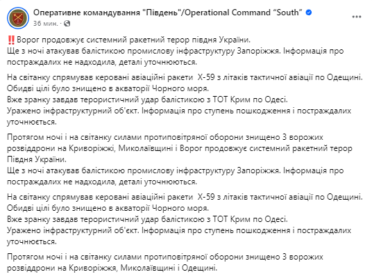 На рассвете направили управляемые авиационные ракеты Х-59 с самолетов тактической авиации по Одесской области. Обе цели были уничтожены в акватории Черного моря.