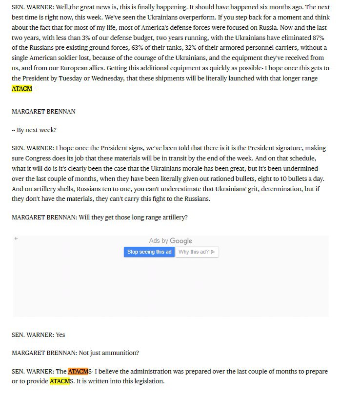 "Я надеюсь, когда это (законопроект о помощи Киеву - Ред.) дойдет до президента во вторник или среду, то поставки будут буквально запущены с дальнобойными ATACMS", - сказал сенатор.
