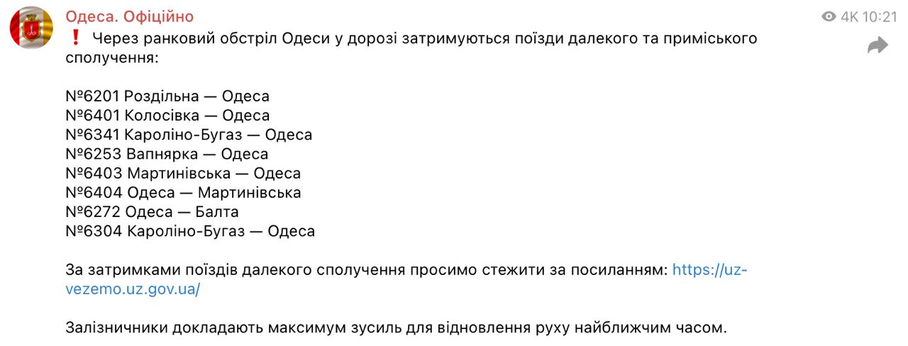 10.35 Из-за утреннего обстрела Одессы задерживается ряд поездов, сообщает мэрия.