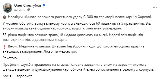 Глава Харьковской ОВА Олег Синегубов показал кадры последствия ночного удара С-300 по территории 3-й психиатрической больницы в Харькове.