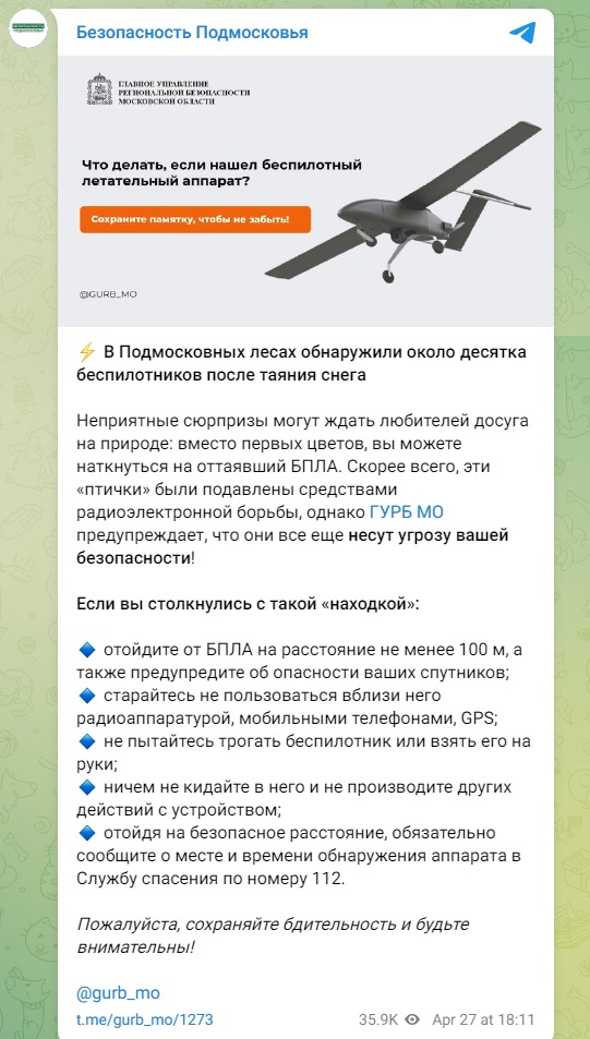 "Неприятные сюрпризы могут ждать любителей досуга на природе: вместо первых цветов вы можете наткнуться на оттаявший БПЛА. Скорее всего, эти "птички" были подавлены средствами радиоэлектронной борьбы, однако ГУРБ МО предупреждает, что они все еще несут угрозу вашей безопасности!" - сказано в публикации.