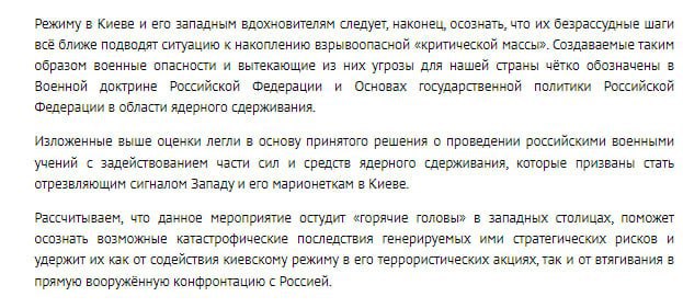 "Создаваемые таким образом военные опасности и вытекающие из них угрозы для нашей страны чётко обозначены в Военной доктрине РФ и Основах государственной политики Российской Федерации в области ядерного сдерживания (в документах описываются ситуации, при которых Россия может применить ядерное оружие - Ред.)... Рассчитываем, что данное мероприятие (ядерные учения - Ред.) остудит горячие головы в западных столицах, поможет осознать возможные катастрофические последствия генерируемых ими стратегических рисков, удержит их от втягивания в прямую вооружённую конфронтацию с Россией", - говорится в заявлении МИД.