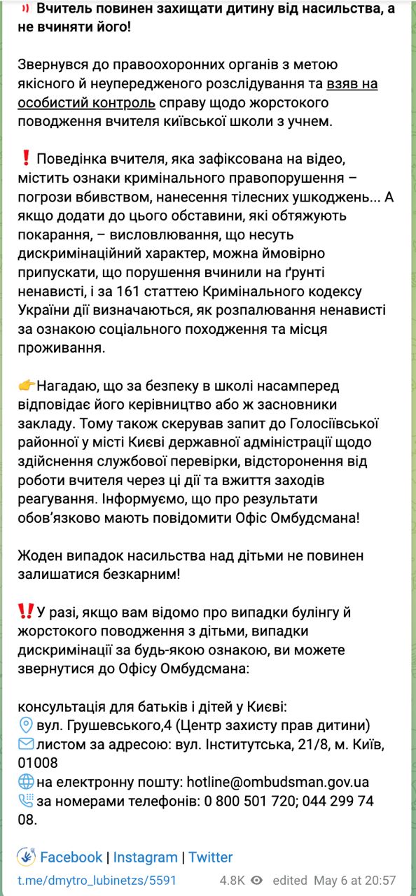 Лубинец сообщил, что видит в поведении учителя признаки угрозы убийством, нанесение телесных повреждений и действия дискриминационного характера на почве ненависти, которые можно трактовать как разжигание ненависти по признаку социального происхождения и места жительства.