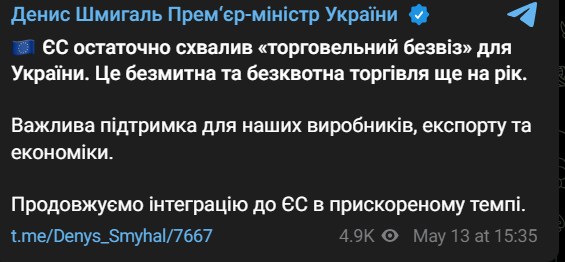 Евросоюз окончательно утвердил продление беспошлинной торговли с Украиной еще на год - Шмыгаль