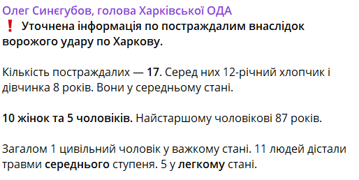 Во второй половине дня вторника, 14 мая, россияне за два часа нанесли не менее четырех ударов по Харькову. Под обстрел кроме прочего попало десятиэтажное жилое здание в центре города. Пострадали 17 человек, в том числе дети.