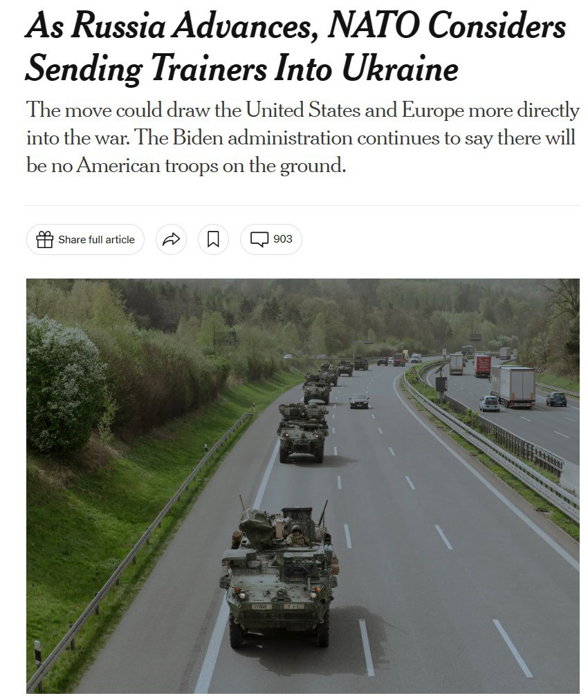 07.55 В НАТО рассматривают возможность отправки в Украину инструкторов для обучения ВСУ. Но у Байдена против, поскольку может вовлечь США и Европу в войну, пишет New York Times.