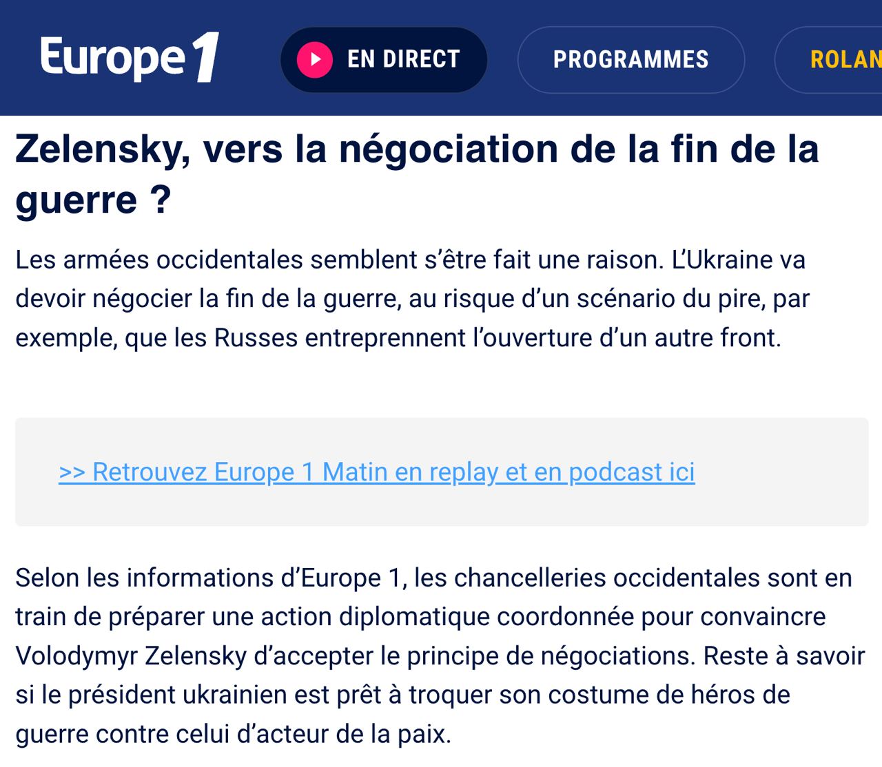 "Западные армии, похоже, опомнились. Украине придется договариваться об окончании войны, рискуя получить худший сценарий, при котором русские откроют еще один фронт. По данным Europe 1, западные канцелярии готовят скоординированную дипломатическую акцию, чтобы убедить Владимира Зеленского принять принцип переговоров. Пока неясно, готов ли украинский президент сменить костюм героя войны на костюм миротворца", - пишет издание.
