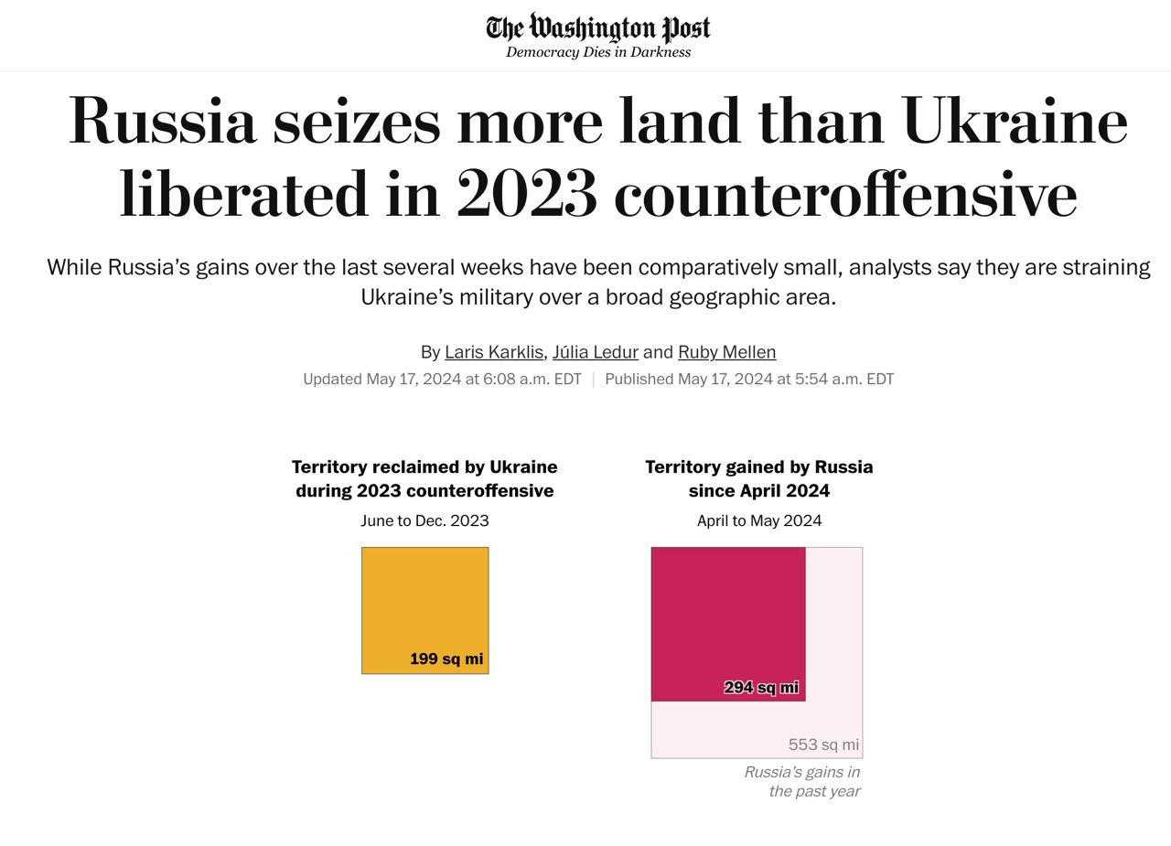 17:41 Армия РФ с апреля 2024 захватила больше территории, чем Украина освободила за 3 месяца летнего контрнаступления 2023, пишет The Washington Post.