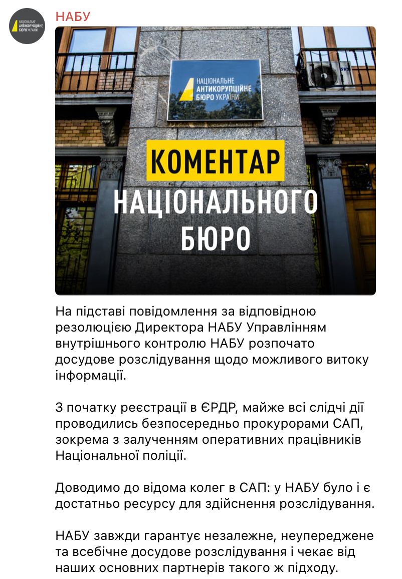 "Сообщаем коллегам в САП: у НАБУ было и есть достаточно ресурса для осуществления расследования. НАБУ всегда гарантирует независимое, беспристрастное и всестороннее досудебное расследование и ждет от наших основных партнеров такого же подхода", - говорится в сообщении.