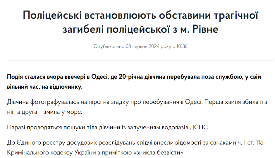 На юг девушка приехала в отпуск из Ровно. По данным пабликов, погибла Олеся Олещук, которая работала участковой.